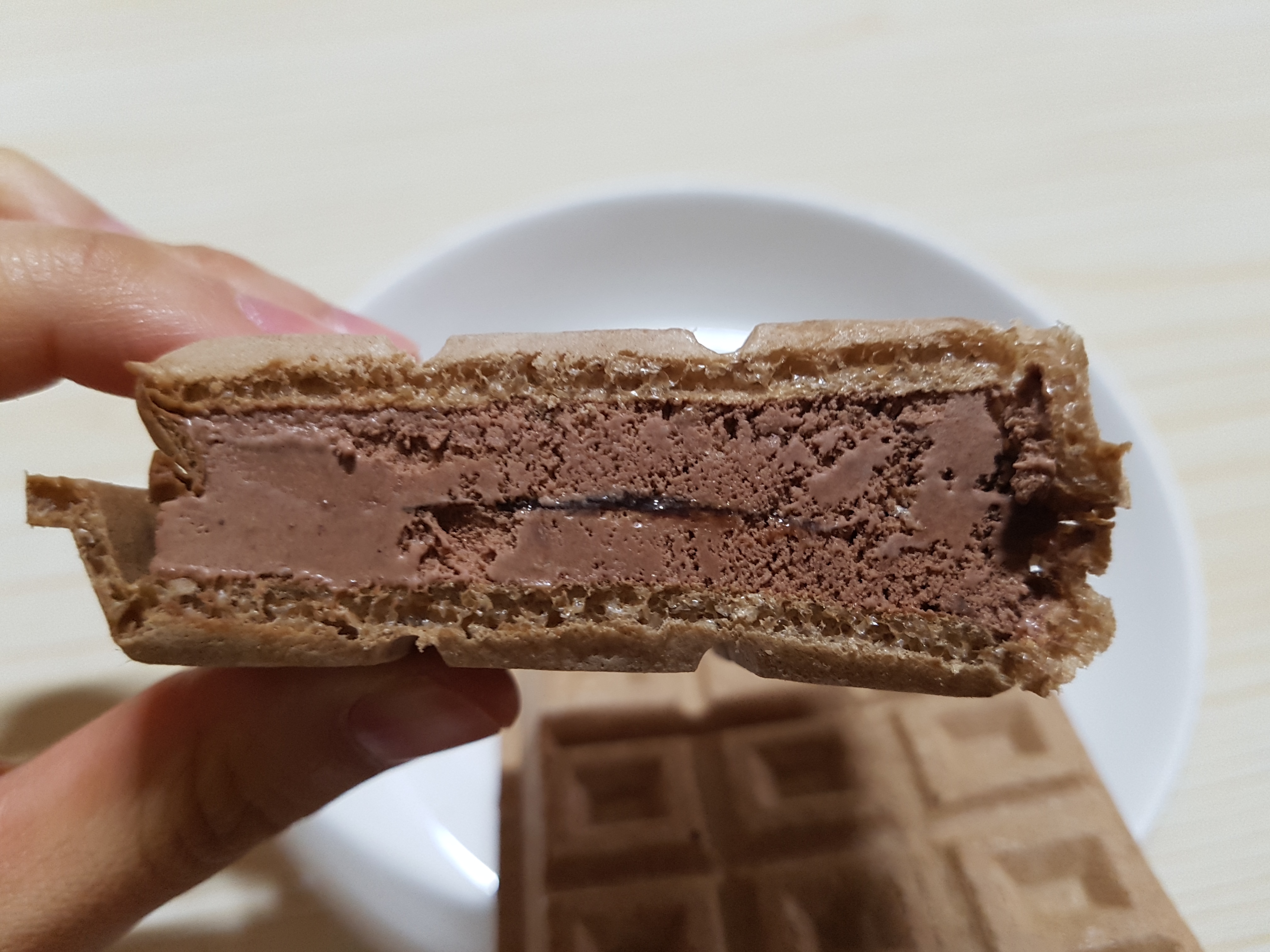 한입 먹어 봤을 때 역시 겉면은 평범한 샌드 과자였고, 아이스크림 부분은 빵빠레 초코맛 같은 식감의 초콜릿 아이스크림이었습니다. 이것만 보면 별 다를 게 없어서 실망스러울 수도 있지만!!