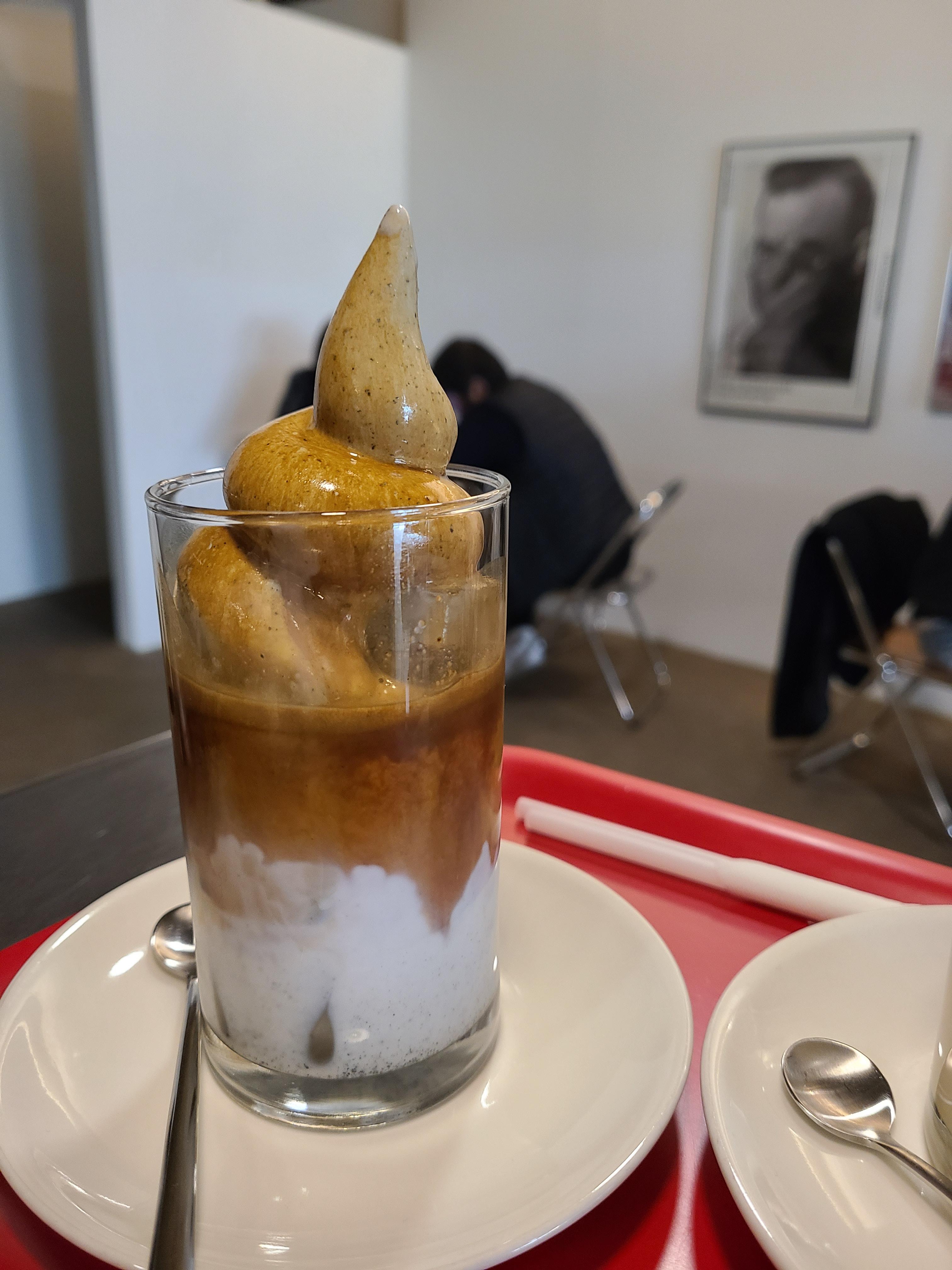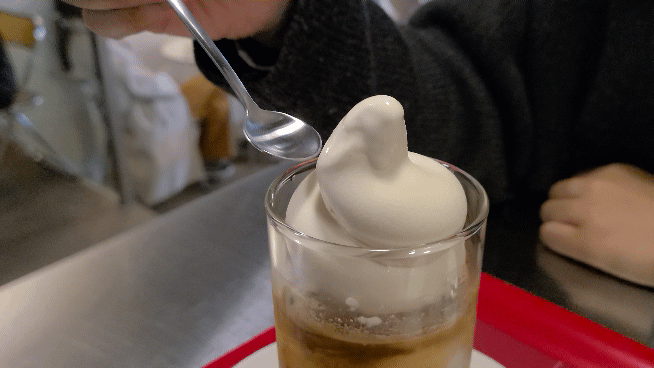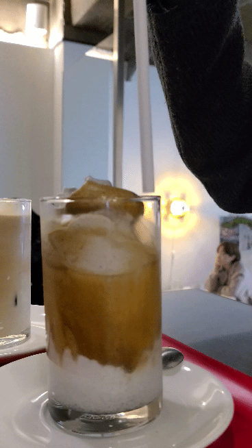 위에 얹힌 아이스크림을 스푼으로 살살 먹고 그동안에 층을 이루는 커피들은 서서히 섞이면서 완전체가 될 겁니다.