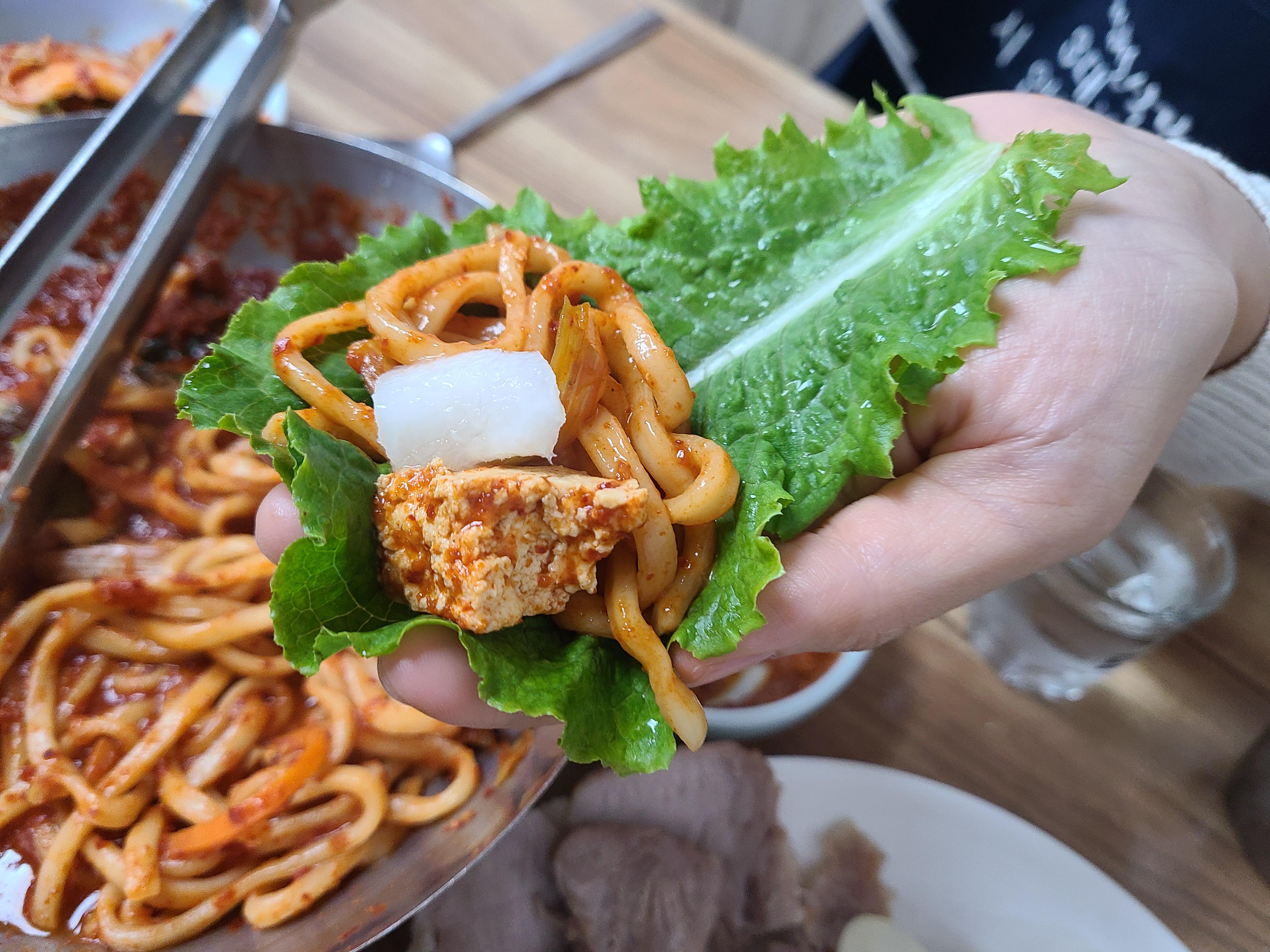 상추쌈에 수육과 두부를 넣어서 한입 먹어보기도 하고요! 칼국수를 넣어서 한입 먹어보기도 합니다!