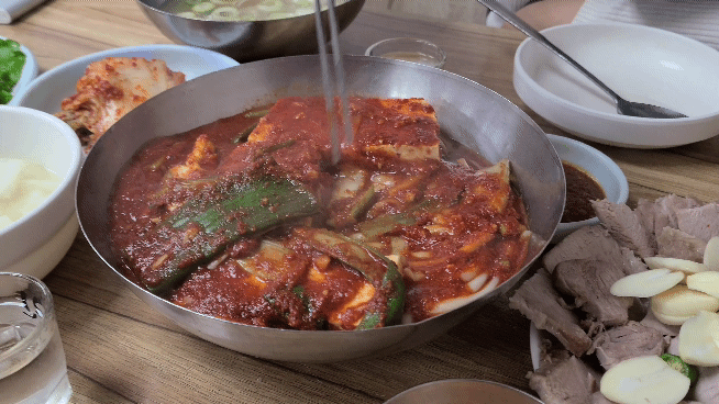 그리고 두부도 젓가락으로 쓱~ 가른 후에 한입 쏙! 먹어보는데 그 두부의 깔끔한 맛이 제대로 나고 광천식당의 양념이 매우실 거라 우려하시는 분도 있고, 저 또한 맵지 않을까~ 생각이 들었는데 요즘 매운맛에 단맛을 좀 넣는 그런 게 조금 있는데, 이 광천식당의 매운맛은 정말 예스러운.. 단맛이 없는 매운맛이고 색깔이 빨간 것 치고 전혀 맵지 않습니다! 호로록 들어가요!